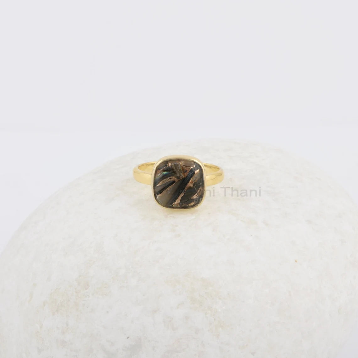 Beautiful Black Shell Cushion Ring, Black Copper Shell 10x10mm Gemstone Ring, Micron Gold Plated Silver Ring, Wedding Gift Ring For Womens