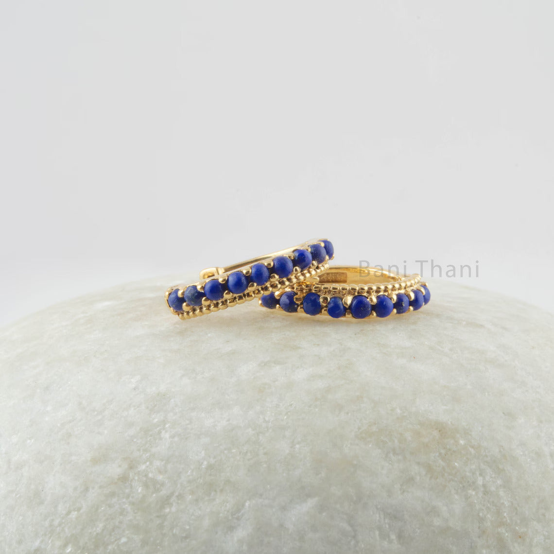 Beautiful Hoop Earrings, Lapis Lazuli Gemstone Silver Earrings For Women, 18k Gold Plated Prong Earrings, Anniversary Gift For Wife