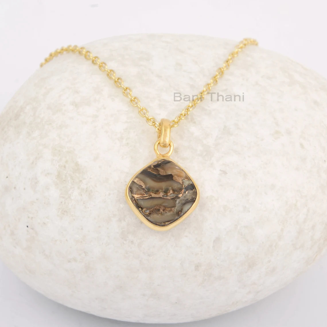 Black Copper Shell 12mm Cushion Necklace, 18k Gold Plated Handmade Gemstone Necklace, Sterling Silver Bezel Necklace For Her, Boho Necklace