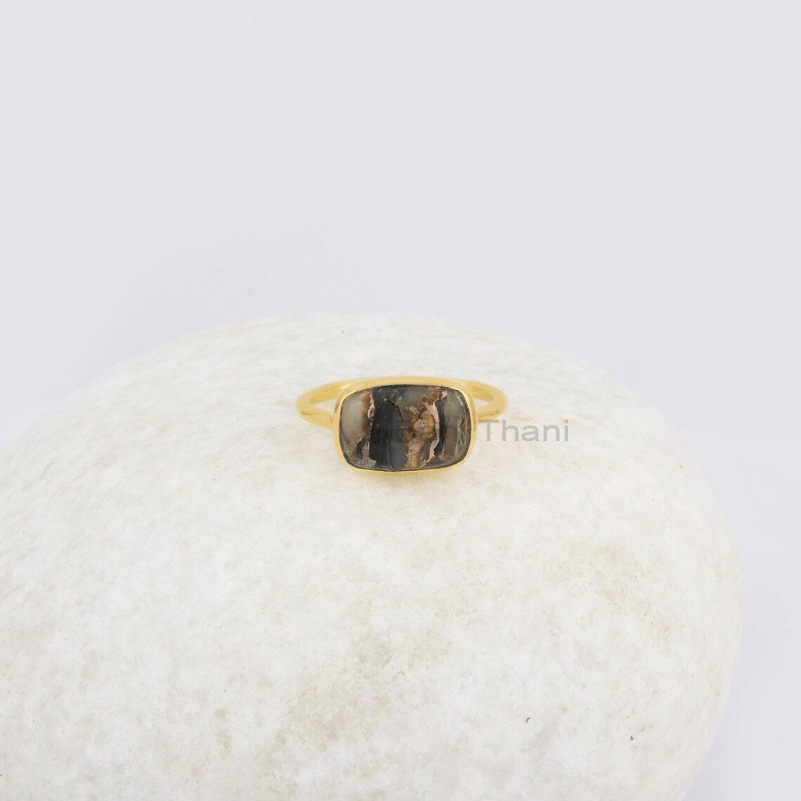 Black Copper Shell Cushion Ring, Black Shell 8x12mm Gemstone Ring, 18k Gold Plated 925 Sterling Silver Bezel Set Ring, Christmas Gift Ring