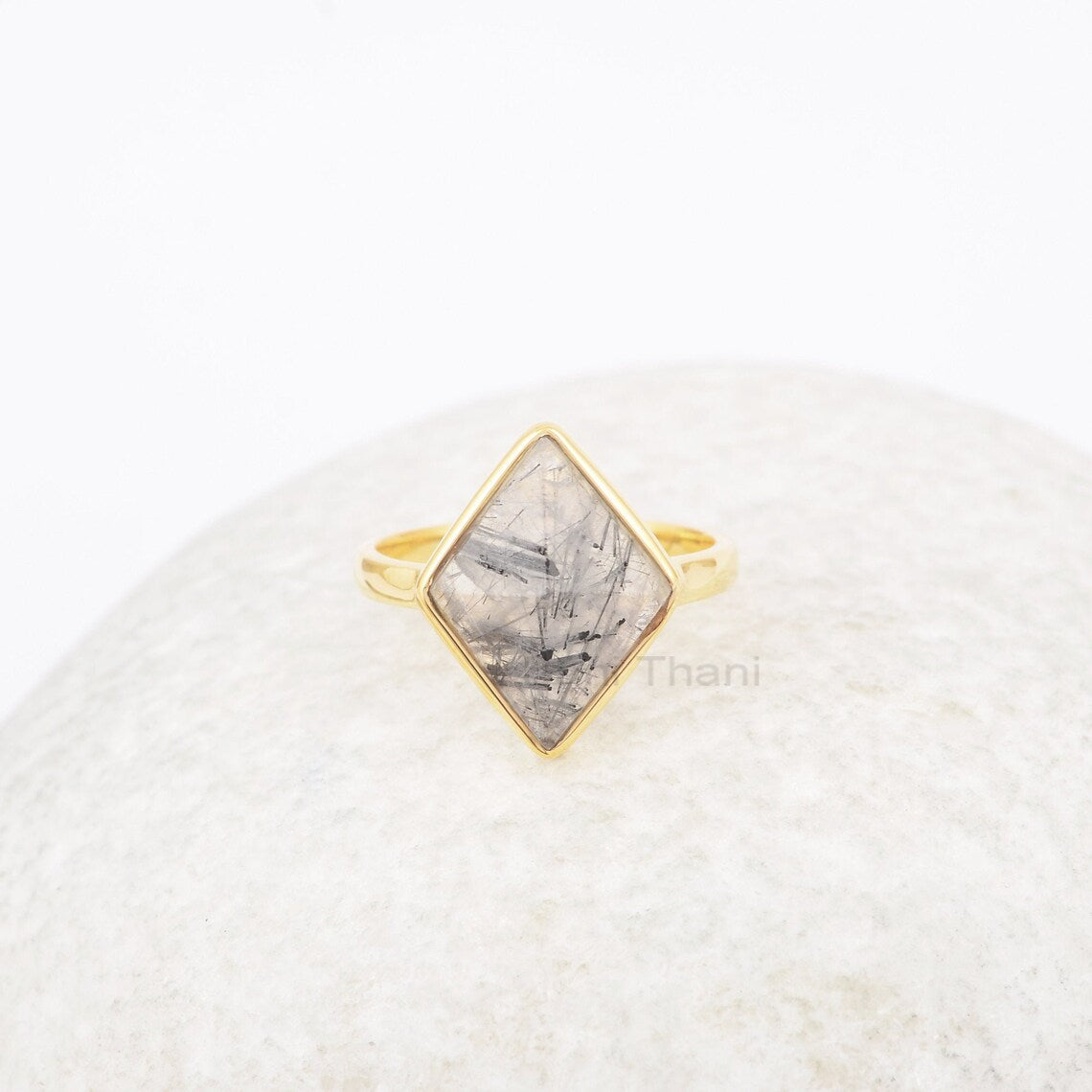 Black Rutile Ring - 925 Sterling Silver Ring - 12x16mm Pyramid - Gemstone Ring - Gold Plated Ring - Gift for Summer - Jewelry for Protection