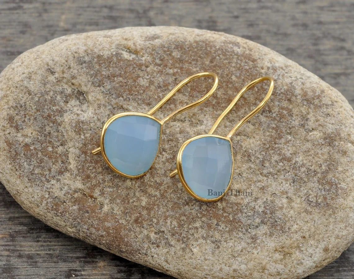 Blue Chalcedony Faceted Heart 12mm Micron Gold Plated 925 Sterling Silver Dangle Earring, Bezel Earring, Gift Earring, Heart Earring For Her