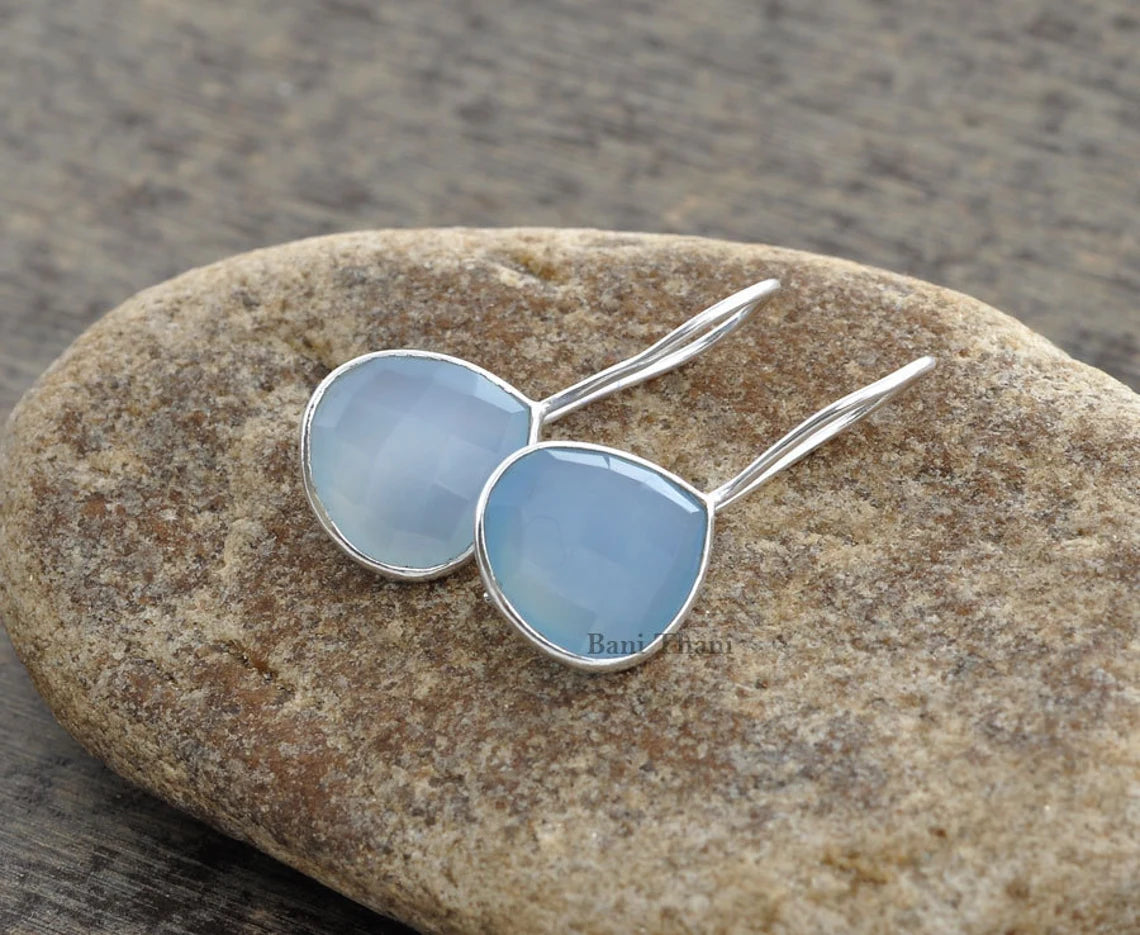 Beautiful Blue Chalcedony Faceted 12mm Heart Shape Gemstone Drop Earrings, 925 Sterling Silver Earrings, Hook Earrings, Wedding Gift Earring