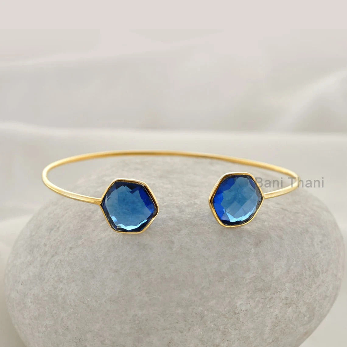 Blue Sapphire Bracelet Micron Gold Plated Quartz Faceted Hexagon 12mm 925 Sterling Silver Bangle, Women Bracelet
