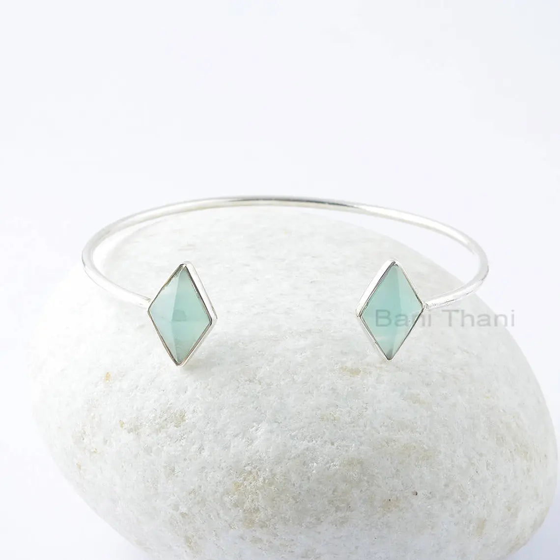 Chalcedony Bracelet, Aqua Chalcedony 10x16mm Diamond Pyramid Sterling Silver Gemstone Bangle, Valentines Day Gift For Her