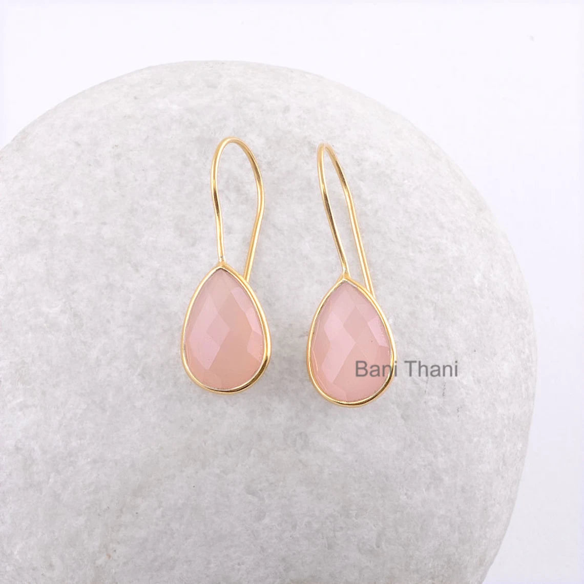 Chalcedony Earring, Pink Chalcedony 10x15mm Pear Gemstone Earring, Micron Gold Plated Pink Dangle Earring 925 Sterling Silver Dangle Earring