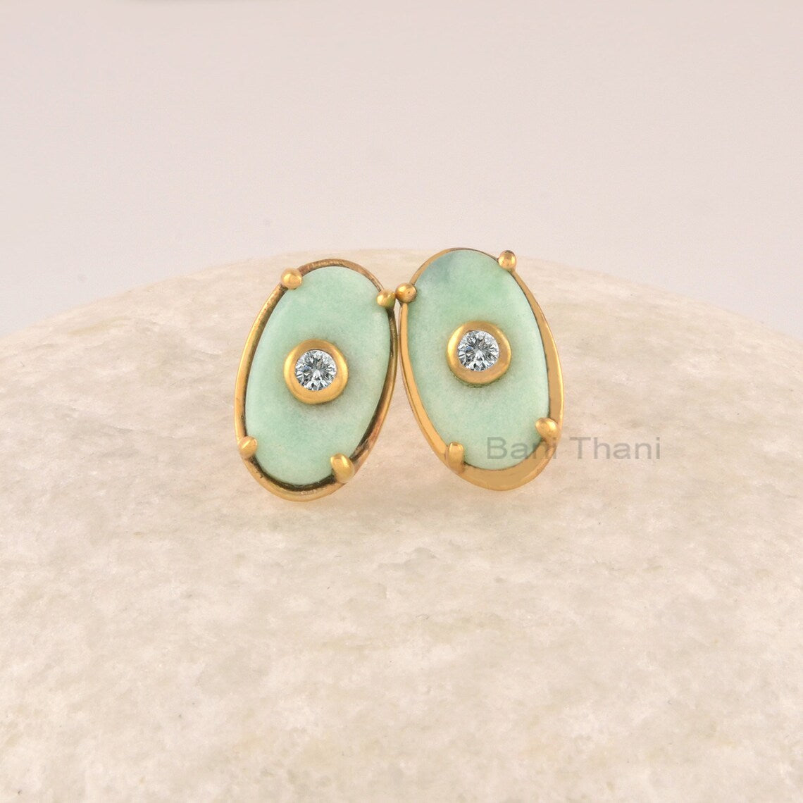 Chrysoprase Stud Earrings - 12x7mm Oval Shaped Sterling Silver Earring - Gold Plated Handmade Earring - Anniversary Gifts - Jewelry For Her