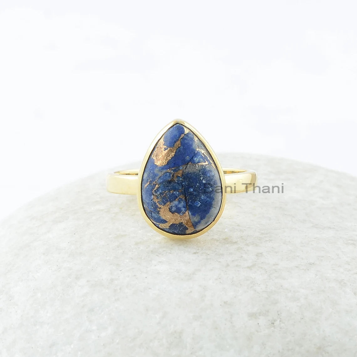 Copper Lapis Lazuli Ring - 10x14mm Pear Gemstone - Sterling Silver - Gold Plated - Manmade Jewelry - Gift for Writer - Jewelry for Young Mom