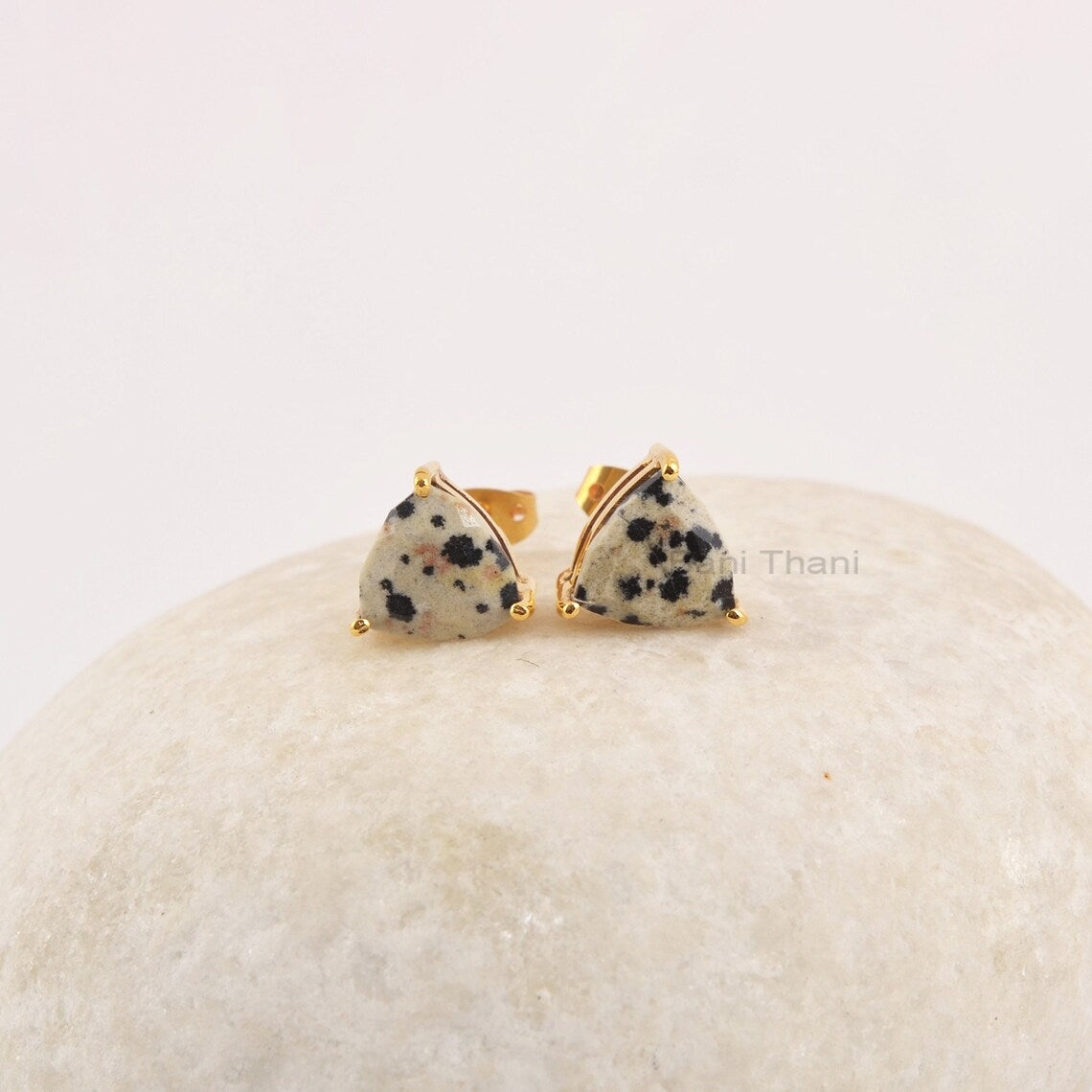 Dalmation Jasper Hexagon Studs Earrings, 10mm Triangle Shape Gemstone Studs, 925 Silver Studs For Christmas Gifts, 18k Gold Plated Studs