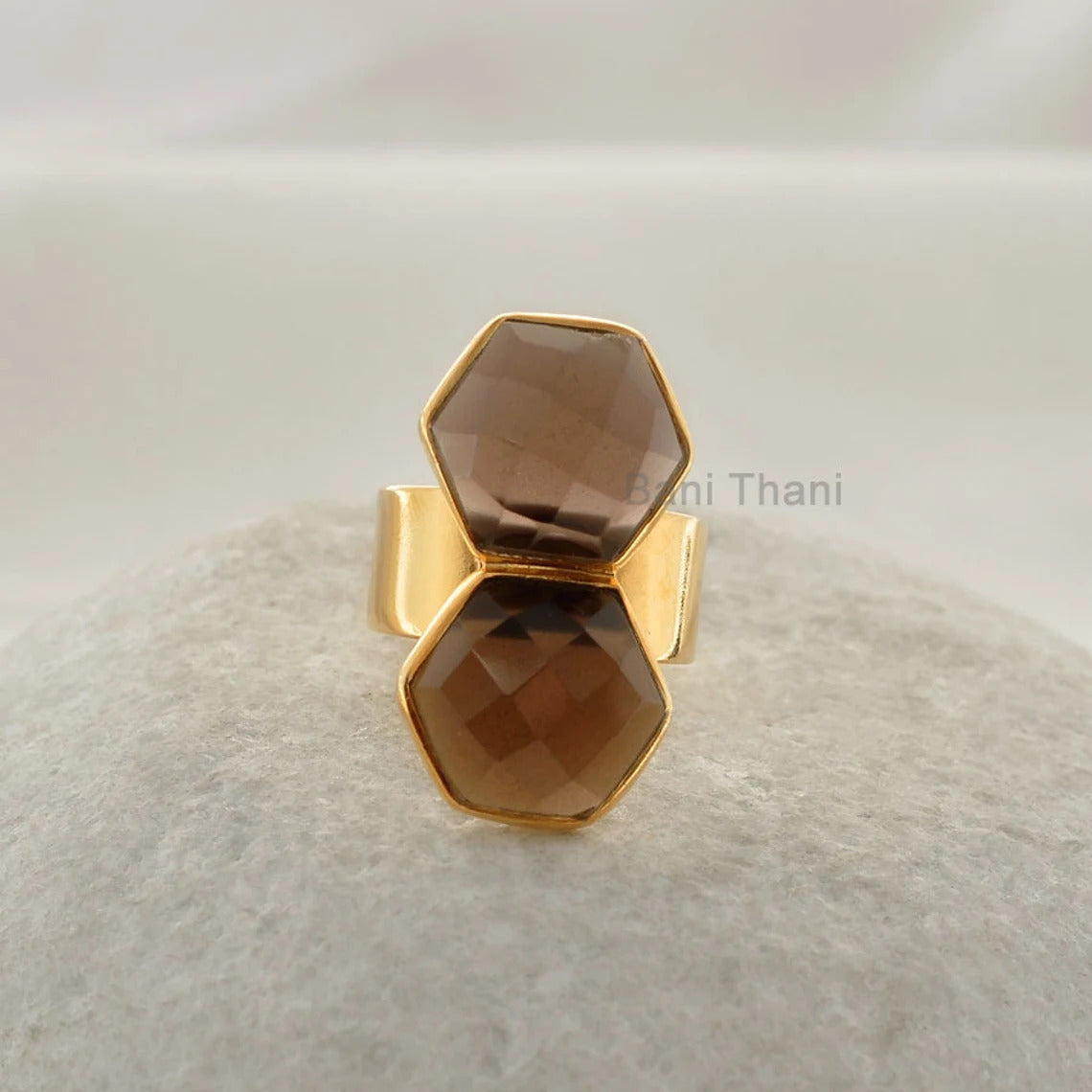 Double Hexagon Gemstone Ring, Smoky Quartz 12mm Gemstone Ring, 18k Gold Plated Sterling Silver Ring, Engagement Gift Ring, Bohemian Ring