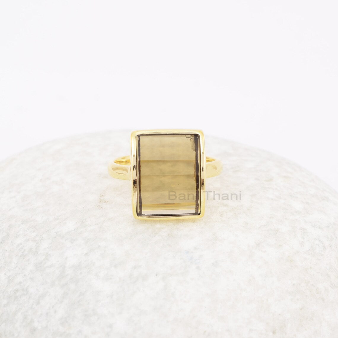 Smoky Quartz 11x14mm Rectangle Step Cut Gemstone Ring, 925 Sterling Silver Handmade Ring, 18k Gold Plated Ring, Dainty Ring, Girls Ring