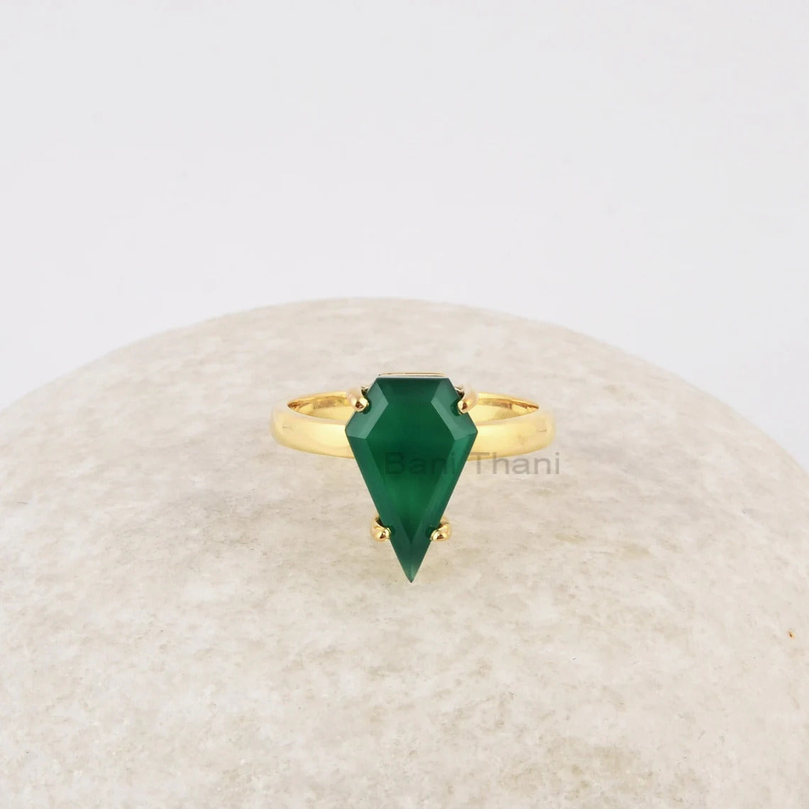 Elegant Green Onyx Diamond Shape Gemstone Ring, Gold Plated Sterling Silver Prong Set Ring, Mother's Day Gift Ring, Anniversary Gift for Her