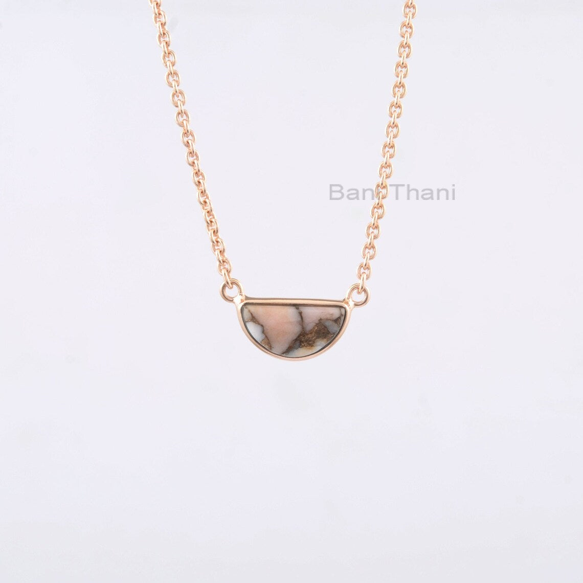 Elegant Pink Opal Copper Necklace, 7x14mm Half Moon Gemstone Necklace, 18k Gold Plated 925 Silver Bezel Necklace, Anniversary Gift Necklace