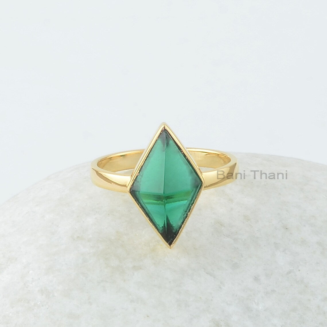 Emerald Quartz Ring, Emerald Quartz 10x16 mm Pyramid Gemstone Ring, Green Emerald Silver Gemstone Bezel Ring, 18k Gold Plated Ring