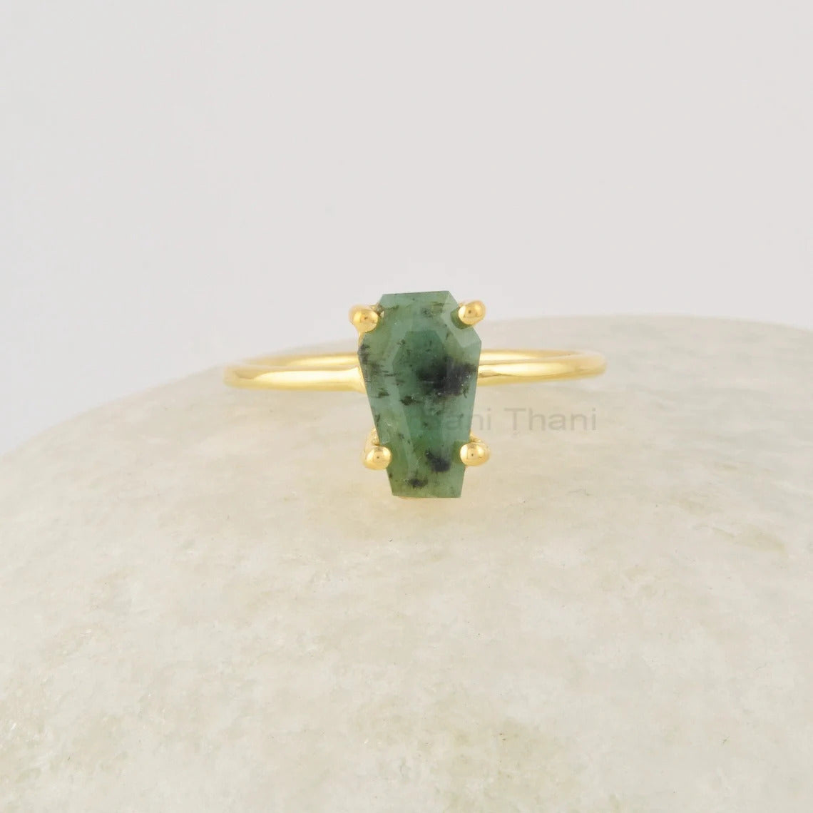 Emerald Ring, Coffin Ring, 5x10mm Gemstone Ring, Handmade Sterling Silver Ring, Simple Emerald Ring, Green Ring in Yellow Gold, Ring For Her