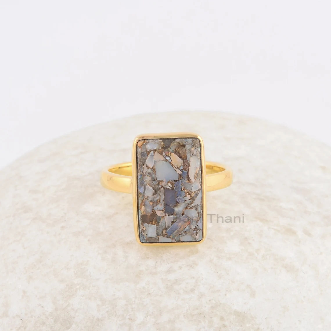 Ethiopian Opal Copper Gemstone Ring, 9x15mm Rectangle Sterling Silver Ring, Mother's Gift Ring, Gemstone Silver Jewelry, Jewelry for Women