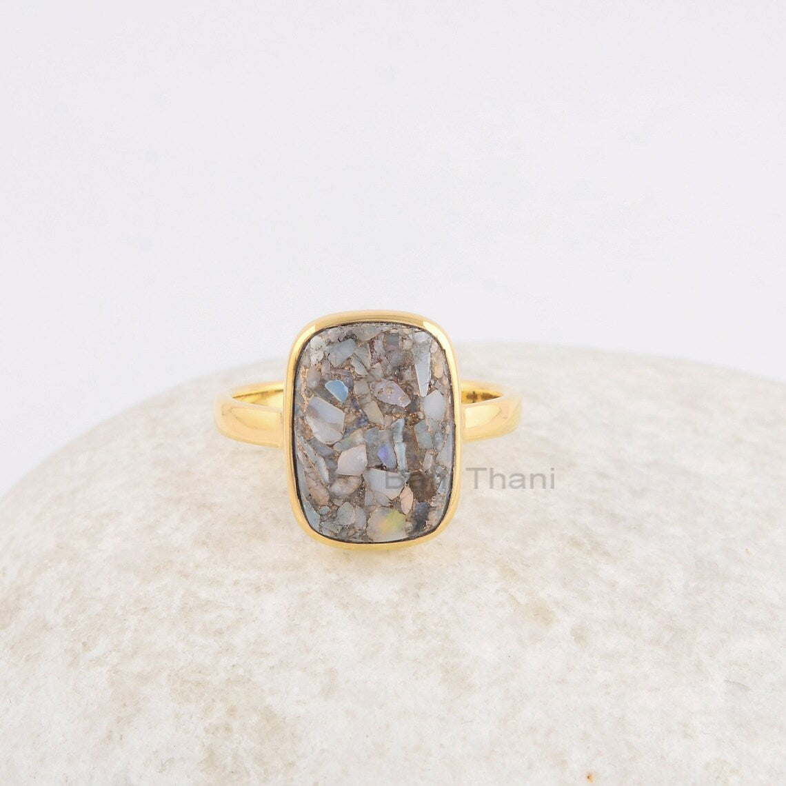 Ethiopian Opal Cushion Gemstone Ring, Ethiopian Opal Copper Silver Bezel Ring, Gold Plated Dainty Ring Jewelry, Simple Ring, Statement Ring