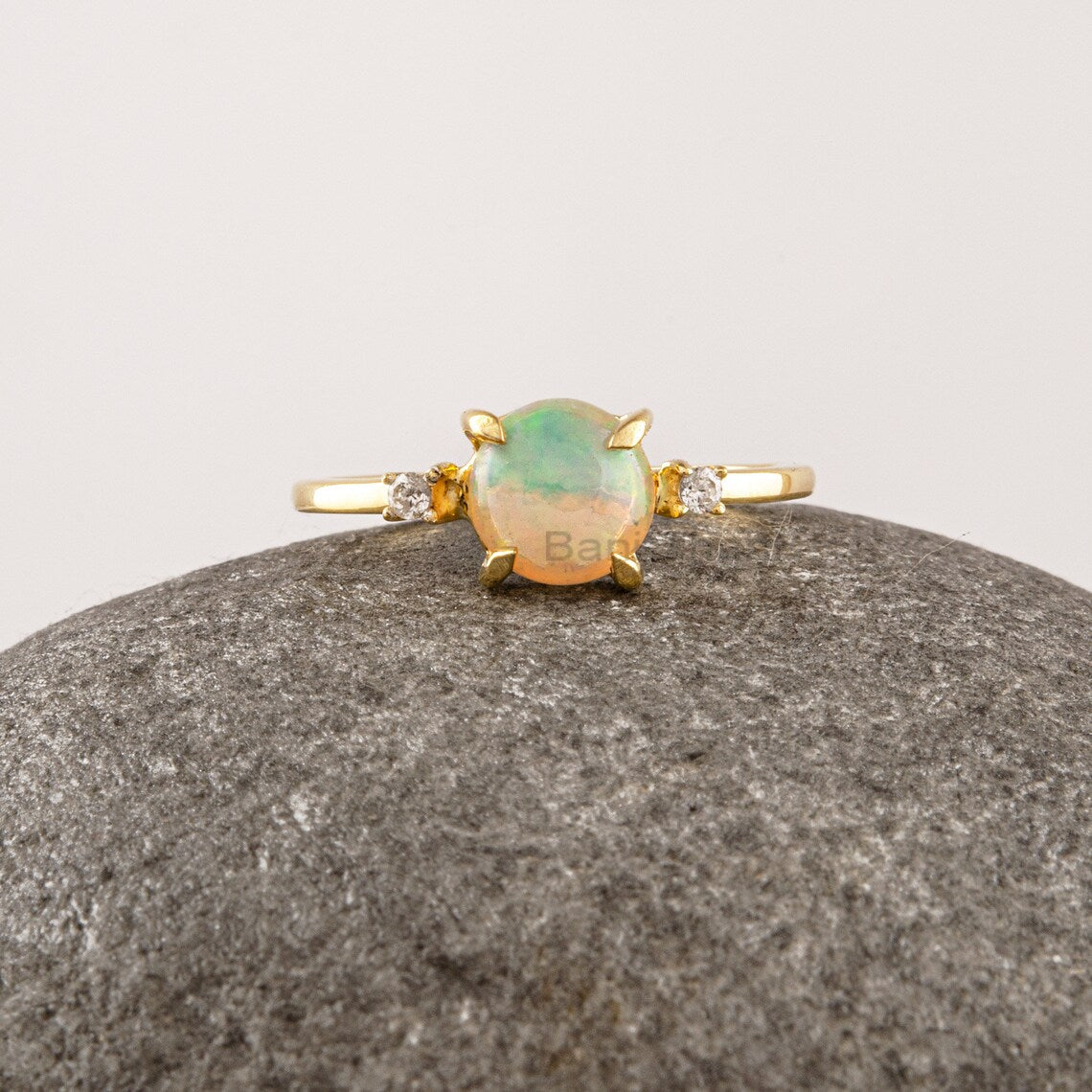 Ethiopian Opal Ring, 7 mm Round Gemstone Ring, Crystal Zircon Gold Plated 925 Sterling Silver Ring, Handmade Dainty Valentine's Day Gift