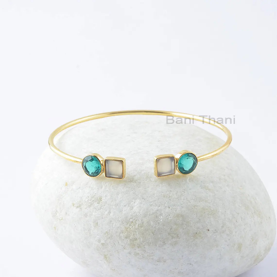 Teal Quartz White Chalcedony Bangle - Solid Silver - 7x7mm Round , 6x6mm Square - Statement Jewelry - Gift For Lady - Jewelry for Prom