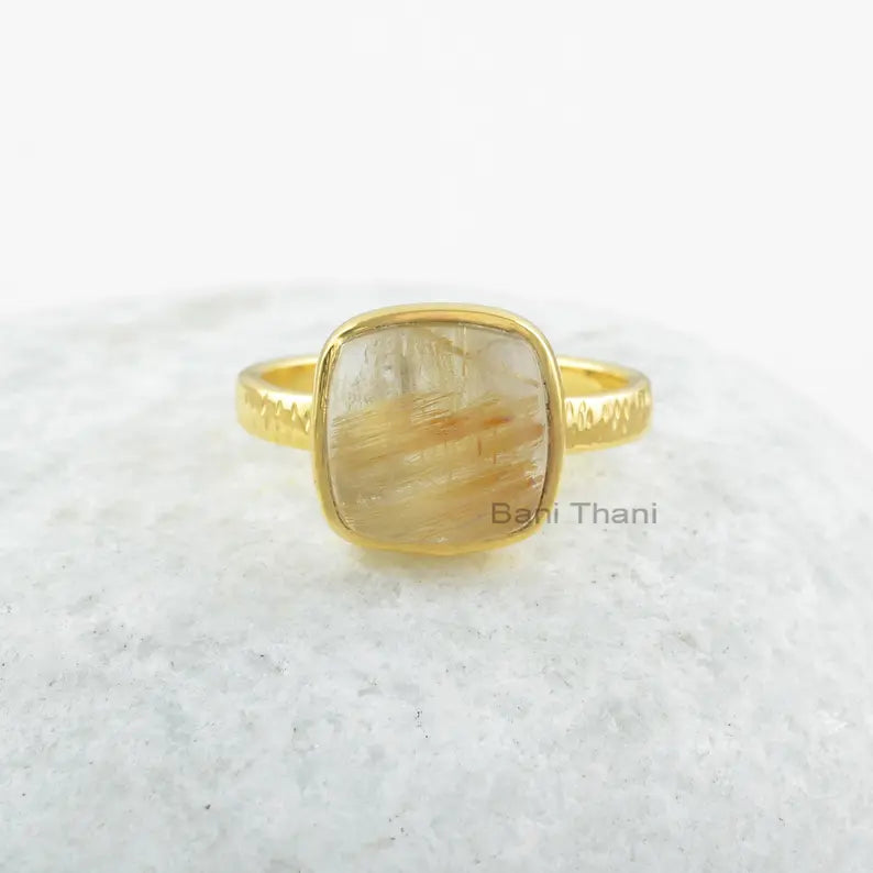 Golden Rutile Gemstone Silver Ring - 925 Sterling Silver Cushion Ring - Gold Plated Handcrafted Ring - Gift for Bridesmaids - Gift for Her