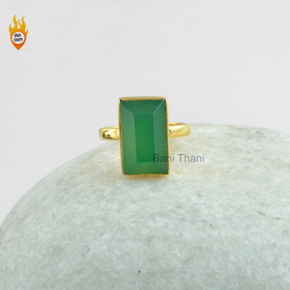 Green Chrysoprase Ring-925 Sterling Silver Ring-Green Chrysoprase Rectangle 9x15mm Micron Gold Plated Ring-Silver Ring for gift-Wedding Ring