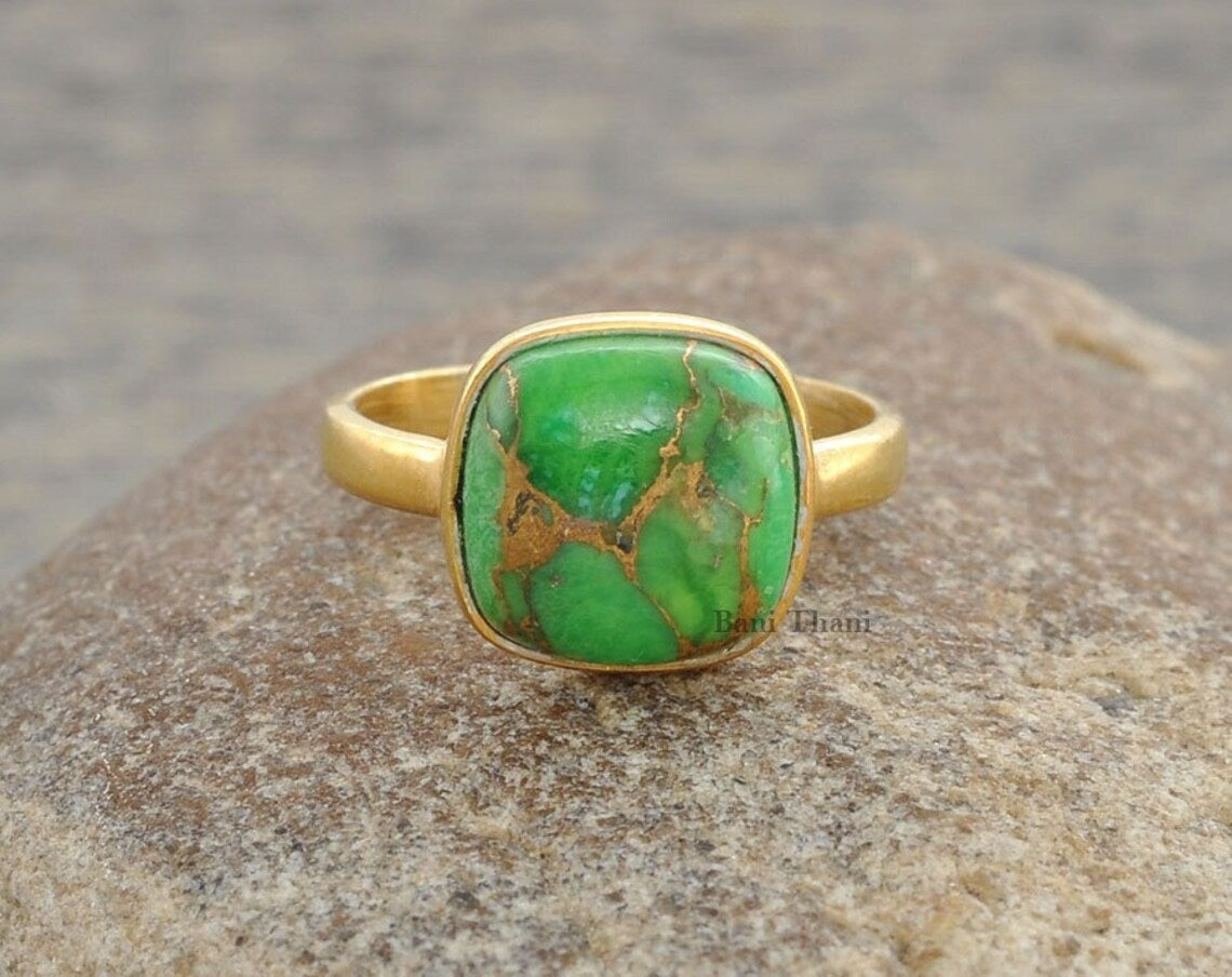 Green Copper Turquoise Ring - 10mm Cushion - 925 Pure Silver - Gold Plated Ring - Gemstone Jewelry - Jewelry for Womens - Gift for Brides