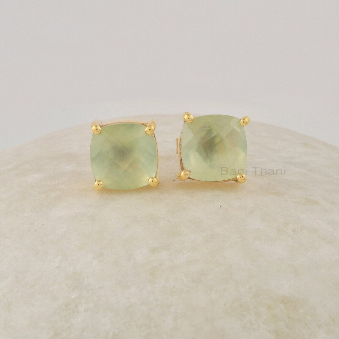 Green Prehnite Stud Earrings, 8mm Cushion Cut Gemstone Studs, Handmade Sterling Silver 18k Gold Plated Women Studs, Anniversary Gift For Mom