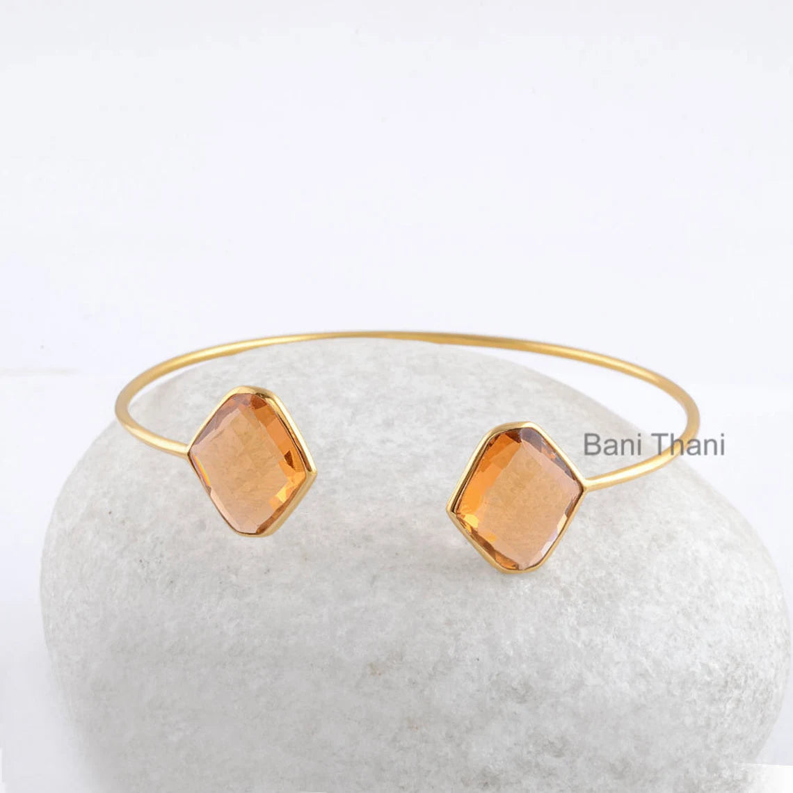 Handmade Champagne Quartz 12x14mm Gemstone Cuff Bracelet, Gold Plated 925 Sterling Silver Bangle, Delicate Bracelet, Wedding Gift Bracelet