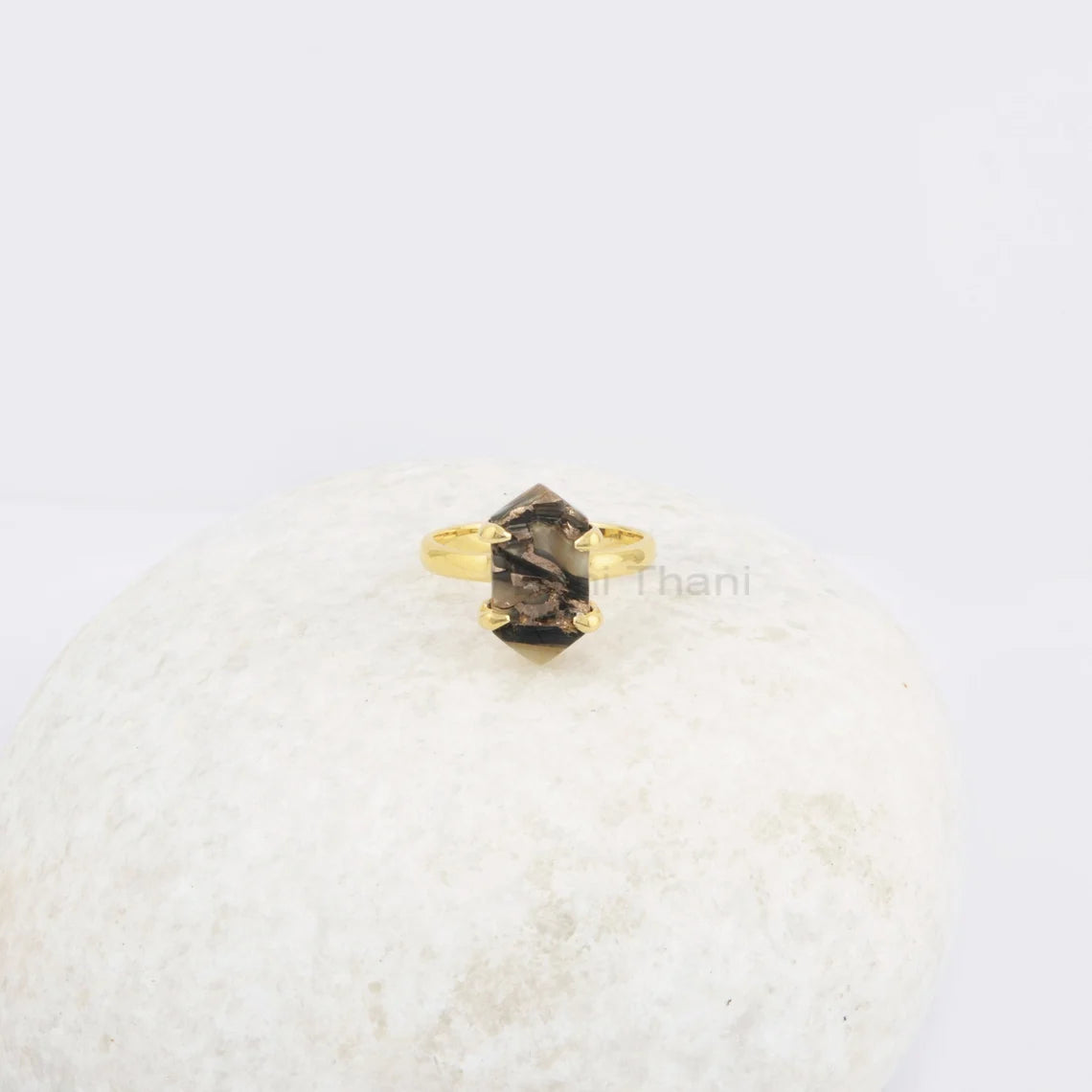 Hexagon Black Copper Shell Ring, Black Shell 8x15 MM Gemstone Ring, Gold Plated 925 Sterling Silver Prong Set Ring, Birthday Gift For Women