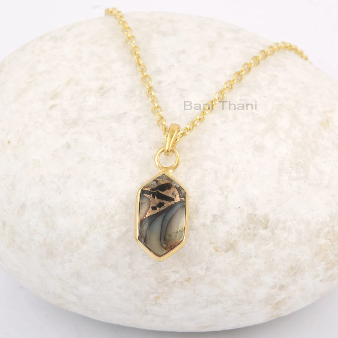 Hexagon Shape Black Copper Shell Necklace, 8x15mm Gemstone Bezel Necklace, Micron Gold Plated 925 Silver Necklace, Women's Gift Necklace