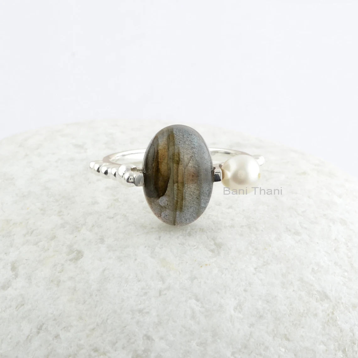 Labradorite Pearl Gemstone Silver Ring - Handmade Oval Ring - 925 Sterling Silver Ring for Anniversary - Valentines Gift Ring - Gift for Her