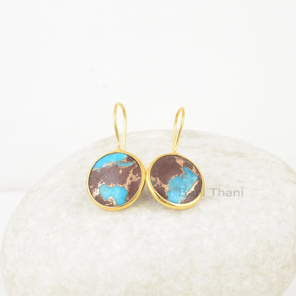 Lava Cooper Turquoise Gorgeous Handmade Earrings, Round 15mm Gemstone Silver Drop Earrings, 18k Gold Plated Earrings For Womens Gift Earring