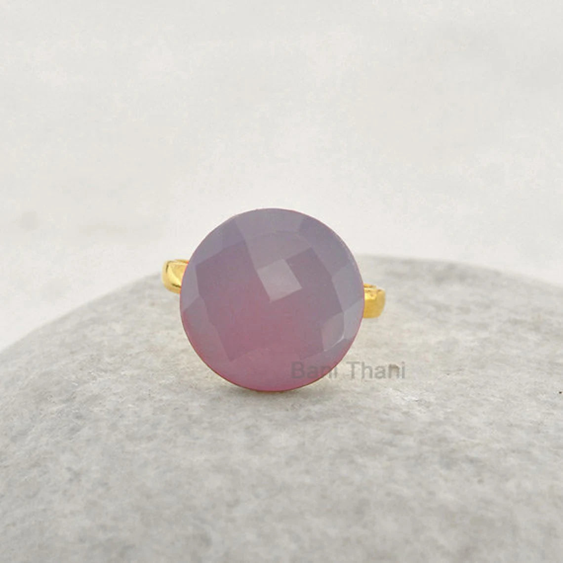 Elegant Chalcedony Ring, Lavender Chalcedony Faceted Round 15mm Gemstone Ring, Micron Gold Plated 925 Sterling Silver Ring, Solitaire Ring