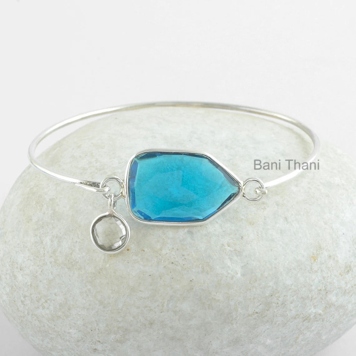 London Blue Topaz, Crystal Quartz Fancy Shape Gemstone Bangle, Gold Plated 925 Sterling Silver Adjustable Bracelet Jewelry, Gift For Her
