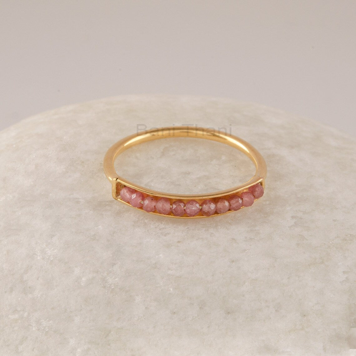 Rose Quartz Band Ring, Half Eternity Round Beads Gemstone Ring, 18k Gold Plated 925 Sterling Silver Ring, Handmade Ring Gift For Her