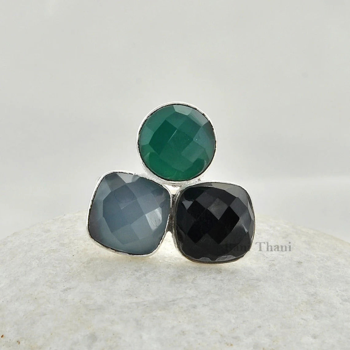Multi Stone Ring - Green Onyx, Blue Chalcedony Gemstone Ring - 925 Sterling Silver Handmade Ring - Boho Ring for Women - Middle Finger Ring
