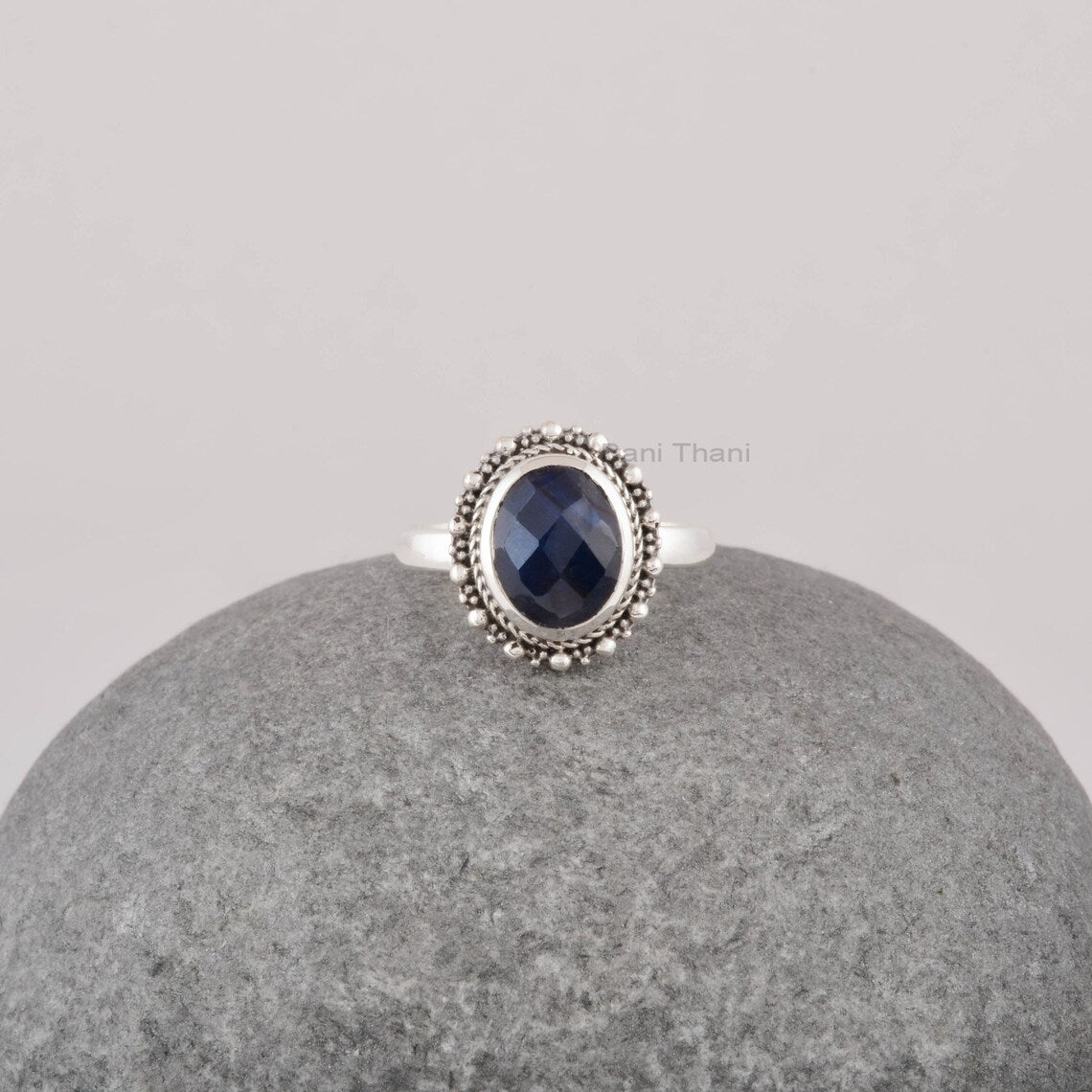 Natural Blue Sapphire Silver Ring - Handmade Gemstone Boho Ring - Solid 925 Silver Dotted Ring Jewelry for Wholesale - Oval Silver Ring