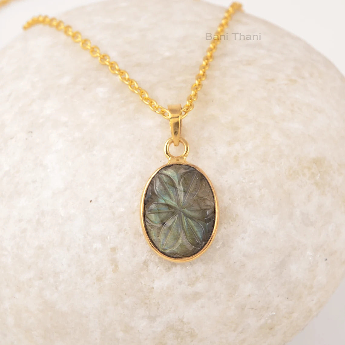 Natural Labradorite Oval Pendant Blue Gemstone Necklace, 925 Silver Gold Plated Hand Carved Stone Necklace, Vintage Simple Necklace For Her