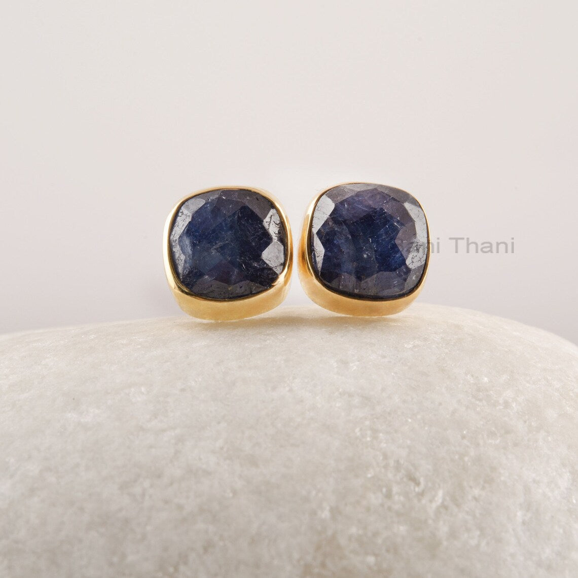 Natural Sapphire Stud Earrings - 925 Sterling Silver - Gold Plated - Natural Gemstone Earrings - Cushion Birthstone Jewelry - Gift For Women
