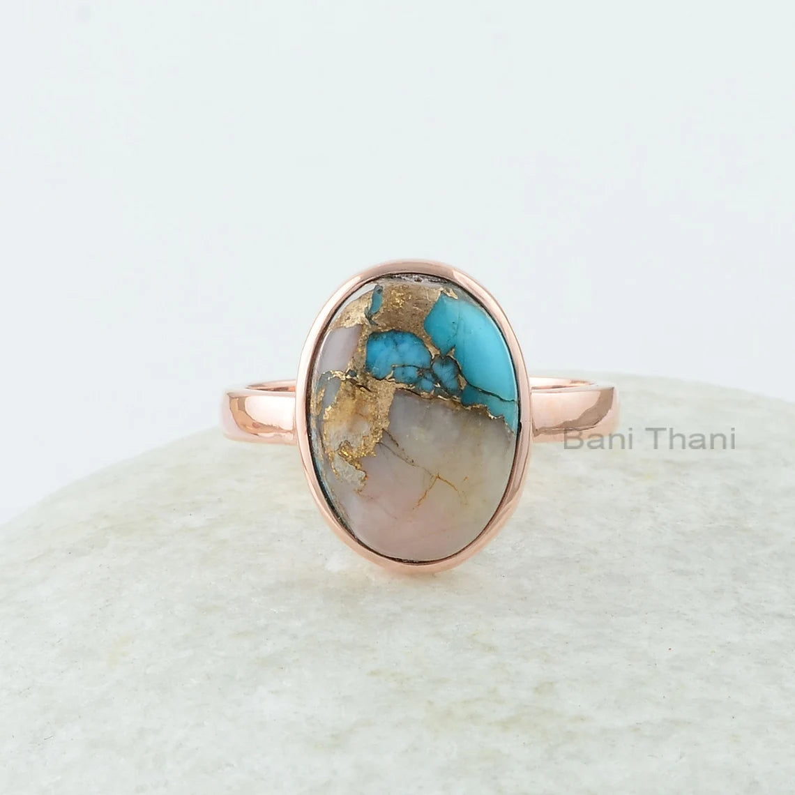 Opal Turquoise Ring, Pink Opal Copper Turquoise 10x14mm Oval Gemstone Ring, Bezel Set Ring, Rose Gold Plated Ring, 925 Silver Turquoise Ring