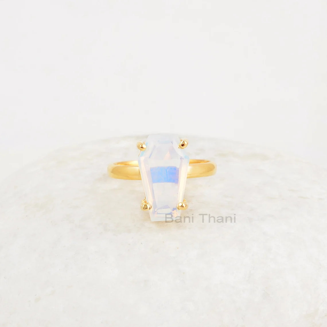Opalite Silver Ring, Opalite Quartz 9x15mm Coffin Shape Gemstone Ring, Prong Set Coffin Ring, Handmade Silver Jewelry For Christmas Gift