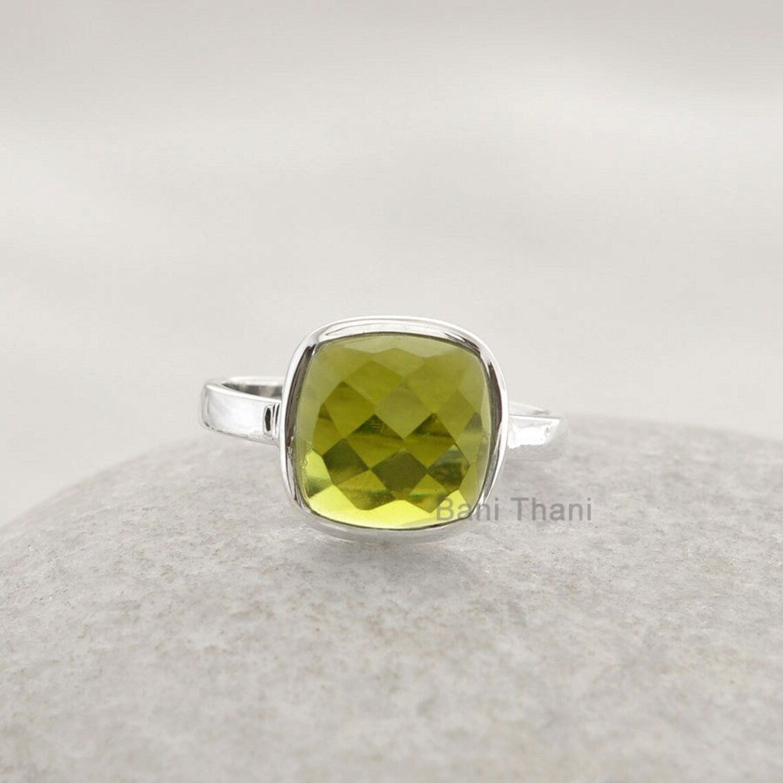 Peridot Quartz 10mm Faceted Cushion Gemstone Ring-925 Sterling Silver Jewelry-Green Peridot Ring-Christmas Gift Ring-Unique Engagement Ring