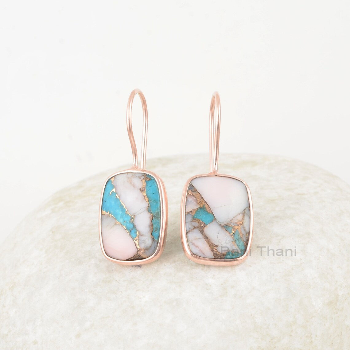 Pink Opal Earrings, Pink Opal Copper Turquoise 12x16mm Cushion Gemstone Silver Drop Earrings, Rose Gold Plated Handmade Earrings For Women's