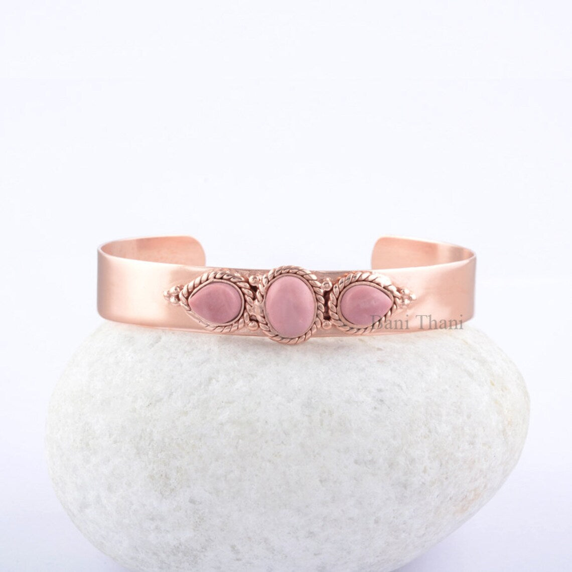 Pink Opal Sterling Silver Rose Gold Cuff Bangle, Three Stone Cuff Bangle, Adjustable Bracelet 925 Sterling Silver Rose Gold Jewelry