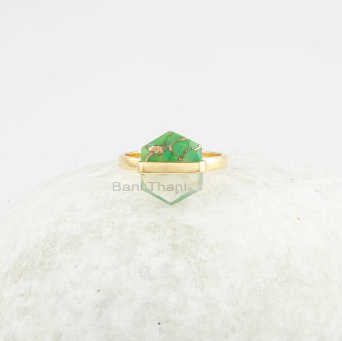 Prehnite Ring - Fused Hexagon Gemstone - 11x13mm Ring - Green Copper - Gold Plated - 925 Solid Silver - Jewelry for The Beach - Dainty Ring