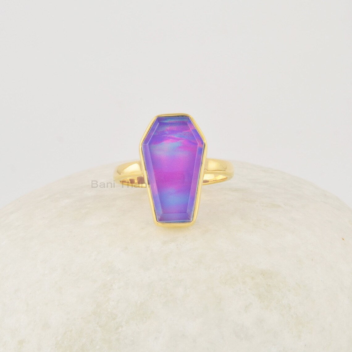 Purple Coffin Ring, Aurora Opal Ring, 10x17mm Gemstone Ring, 925 Silver Ring For Halloween, 18k Gold Plated Vintage Ring, Gothic Coffin Ring