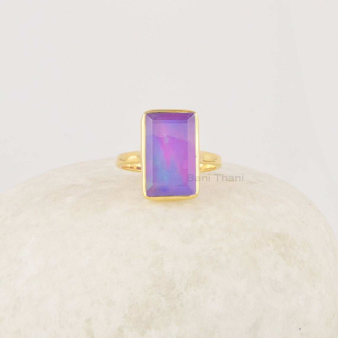 Purple Rectangle Ring, Aurora Opal Ring, Gemstone Solid Silver Ring, 18k Gold Plated Silver Ring, Huge Ring For Women Ring, Handcrafted Ring