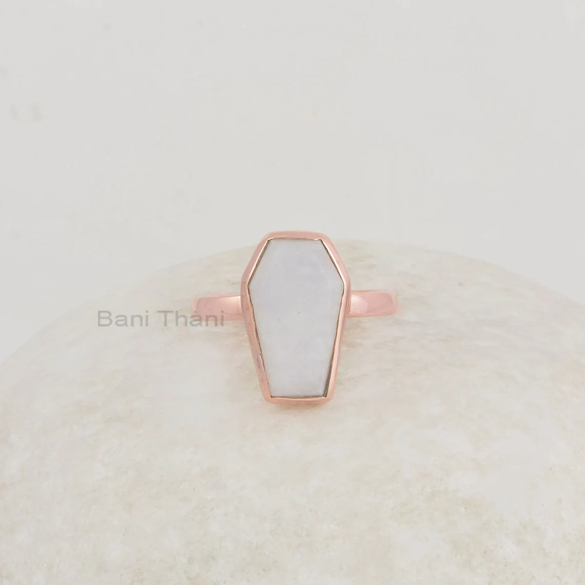 Rainbow Moonstone Ring - 925 Silver Ring - Rose Gold Ring - 9x15mm Coffin - Birthstone Jewelry - Gift for New Beginning - Jewelry for Friend