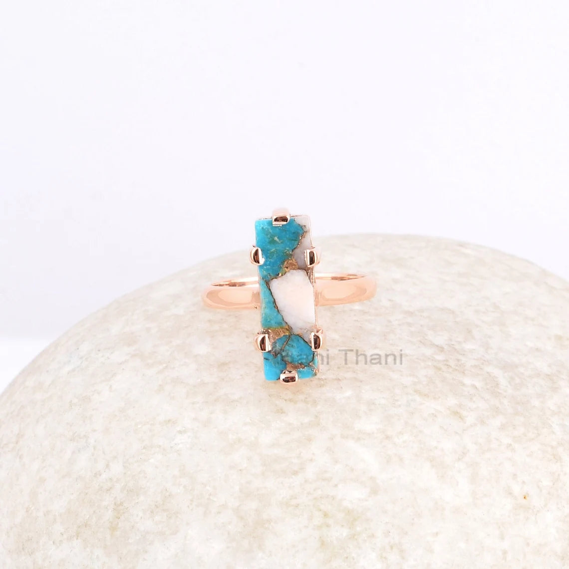 Rectangle Gemstone Ring, Pink Opal Copper Turquoise 6x18mm Rectangle Shape Ring, Rose Gold Plated Ring, Prong Setting Ring, 925 Silver Ring