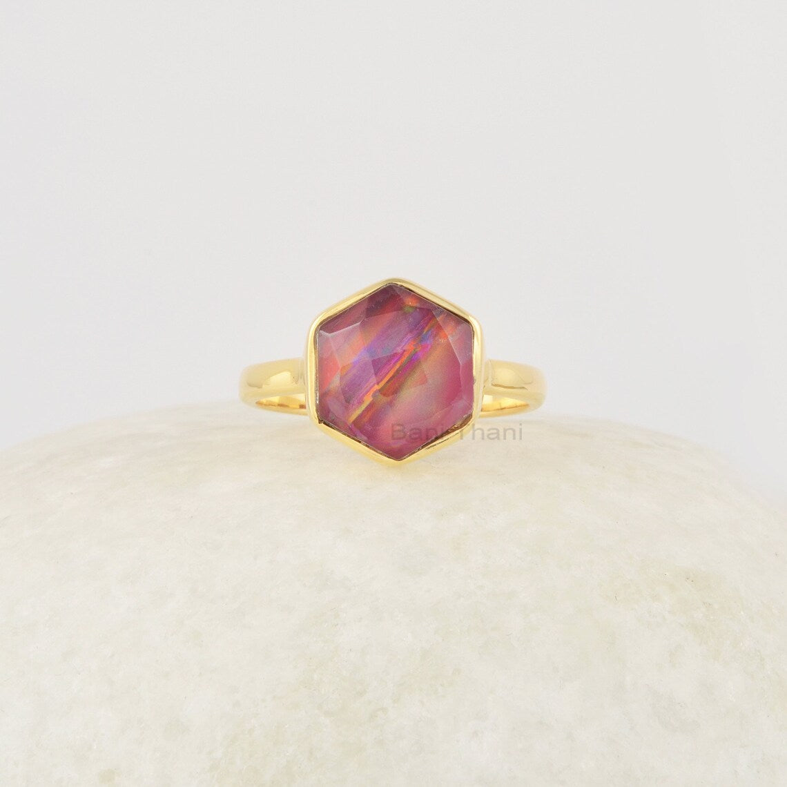 Red Aurora Opal Ring, Red Hexagon 10mm Gemstone Sterling Silver Ring, 18k Gold Plated Vintage Ring, Red Stone Ring, Red Silver Ring For Her